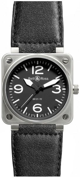 Model: BR01-92-Steel-Blackleather - CASE = [Material:Stainless Steel], [Case Diameter:46], [Case Back:Solid], [Water Resistant:100 Meters - 330 Feet], [Crystal:Scratch Resistant Sapphire],; DIAL = [Color:Black],; MOVEMENT = [Type:Automatic Self Winding],; BAND = [Clasp:Tang Buckle], [Type:Black Calf Leather], (Usually ships in 2 to 4 business days.)
