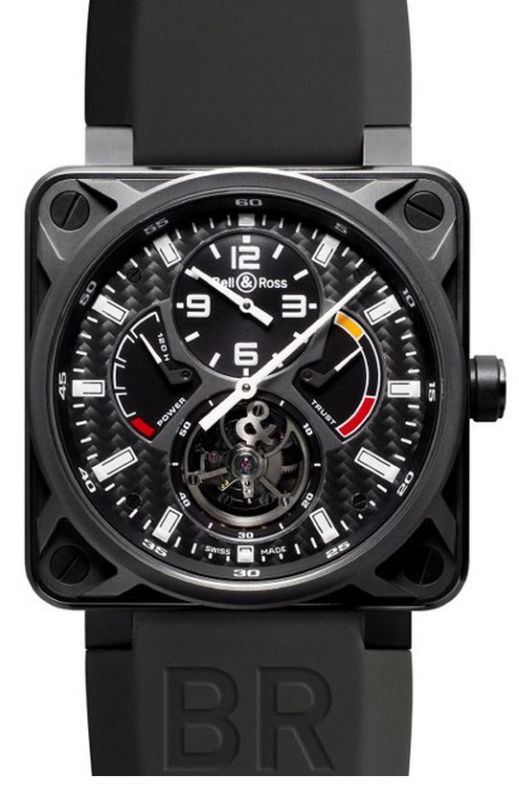Model: BR01-TOURBILLON - CASE = [Case Diameter:46], [Bezel:Fixed], [Case Back:Skeleton], [Water Resistant:100 Meters - 330 Feet], [Crystal:Scratch Resistant Sapphire], DIAL = [Color:Black carbon fiber. Numerals, index and hands covered in a photo-luminescent coating.], MOVEMENT = [Crown:Screw Down], BAND = [Clasp:Tang], [Type:Black Alligator and Rubber.], (Usually ships in 2 to 4 weeks.)