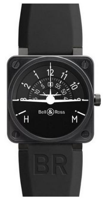 Model: BR0192-TURNCOOR - CASE = [Material:Steel case with matte black PVD finish], [Case Diameter:46], [Bezel:Fixed], [Case Back:Skeleton], [Water Resistant:100 Meters - 330 Feet], [Crystal:Scratch Resistant Sapphire], DIAL = [Color:3 black concentric discs. The markings on the outside disc indicat the hours, the middle disc the minutes and the central disc turns at the rhythm of the seconds.], MOVEMENT = [Type:Automatic Self Winding], [Crown:Screw Down], BAND = [Clasp:Tang], [Type:Black Rubber and Heavy Synthetic Fabric], (Usually ships in 2 to 4 weeks.)