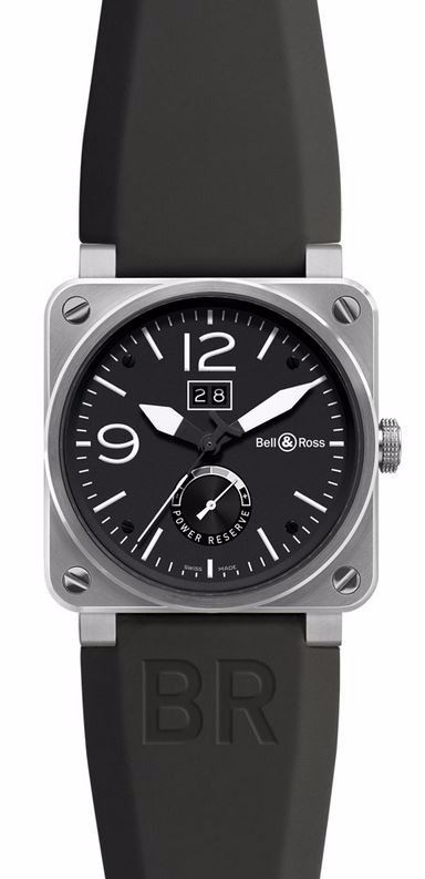 Model: BR03-90 Big Date Power Reserve - CASE = [Material:Stainless Steel], [Case Thickness:9.80mm], [Bezel:Fixed], [Case Back:Solid], [Water Resistant:100 Meters - 330 Feet], [Crystal:Scratch Resistant Sapphire],; DIAL = [Color:Black],; MOVEMENT = [Type:Automatic], [Crown:Push Down],; BAND = [Clasp:Tang], [Type:Black Rubber], (Usually ships in 2 to 4 business days.)