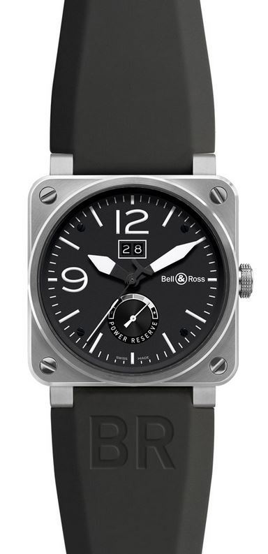 Model: BR03-90 Big Date Power Reserve - CASE = [Material:Stainless Steel], [Case Thickness:9.80mm], [Bezel:Fixed], [Case Back:Solid], [Water Resistant:100 Meters - 330 Feet], [Crystal:Scratch Resistant Sapphire], DIAL = [Color:Black], MOVEMENT = [Type:Automatic], [Crown:Push Down], BAND = [Clasp:Tang], [Type:Black Rubber], (Usually ships in 2 to 4 business days.)