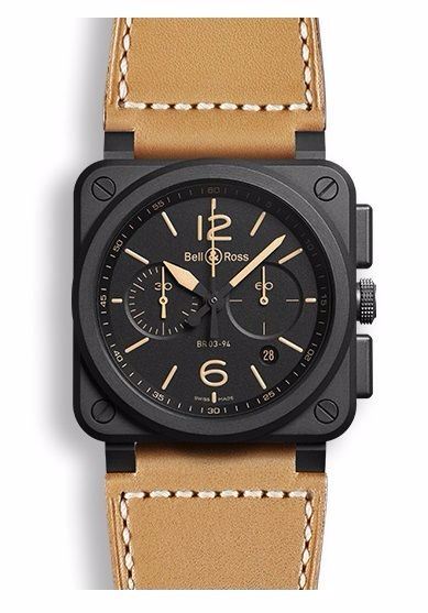 Model: BR0394-HERI-CE - CASE = [Material:Matt Black Ceramic], [Case Diameter:42], [Water Resistant:100 Meters - 330 Feet], [Crystal:Scratch Resistant Sapphire],; DIAL = [Color:Black with Sand Colored Luminescent Hands and Hour Markers],; MOVEMENT = [Type:Automatic],; BAND = [Clasp:Tang], [Type:Beige Calfskin Leather], (In Stock - Ready to ship.)