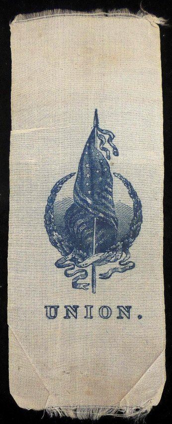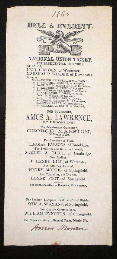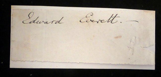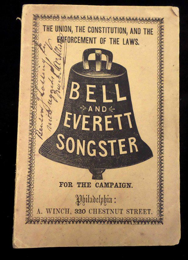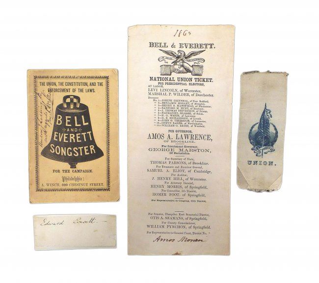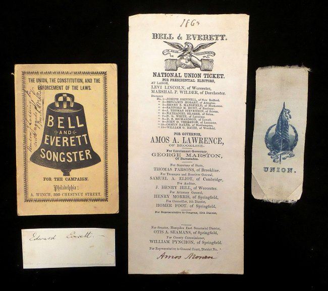 Comprises 1.) Edward Everett's signature on a clipped paper strip [1-3/8" H x 3-5/8" W]. Mounted on conforming backing sheet, age-toning and tear with loss to right edge. 2.) Bell & Everett "National Union Ticket" listing "Levi Lincoln" and "Marshal Wilder" for presidential electors "at large". Features a black and white vignette of two hands shaking surmounted by an eagle holding a ribbon reading "In Union there is Strength." Bears manuscript signature in bottom margin [10-1/8" H x 4-1/2" W]. Age-toning, margin wear with tears, minor creases and few stains. 3.) "Bell and Everett Songster for the Campaign," published by A. Winch, Philadelpjia, Pa., 12mo, 66 pages. Bears hand written inscription on cover. Age-toning, minor water stains, and creases. 4.) Union silk ribbon. Features a blue printed American flag enclosed in a laurel leaf surround [5-1/4" H x 2" W]. Frayed top and bottom edges, age-toning, and creases.