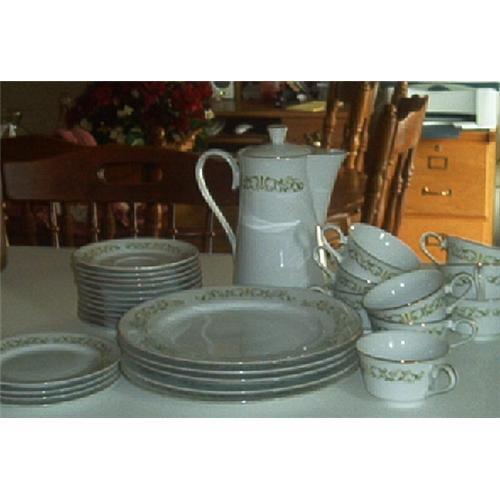 Featuring 31 pieces of fine china from Japan. Name of these pieces is: BELL FLOWER. Partial service that contains the following: 5-Dinner plates; 9-cups; 11-saucers; 4-desert plates; and 1-Coffee Server with lid. Colorful green decorated swirls and all pieces has Gold Trim around all edges. The dinner plates measures 10 1/2 inches in diameter; saucers measures 6 inches in diameter; dessert plates measures 6 1/2 inches in diameter; Coffee server measures 8 inches tall. There are no cracks, chips, etc. on any of the pieces. Excellent Condition.