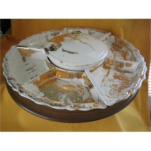 This lazy susan in a lovely gold and white marble or granite pattern is marked: Bell Mfg.Company USA #150-T. I was told this is California Pottery, so far I have not found any information on the Bell Manufacturing and Sales Co. so if anyone knows please email me. On a large wooden base, that turns, the 3 divided bowls that overlap each other with covered center bowl were used for chips and dips in the fifties and sixties. In very good condition it measures 6 inches high and 15 1/2 inches in diameter. A wonderful addition to any retro decor.