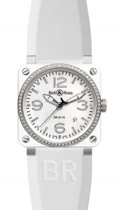 Model: BR03-92-White-Ceramic-Rubber - CASE = [Material:Stainless Steel], [Case Diameter:42], [Case Thickness:9.80mm], [Case Back:Solid], [Water Resistant:100 Meters - 330 Feet], [Crystal:Scratch Resistant Sapphire], DIAL = [Color:Mother of Pearl], MOVEMENT = [Type:Automatic Self Winding], BAND = [Clasp:Tang Buckle], [Type:Rubber White], (Usually ships in 2 to 4 business days.)
