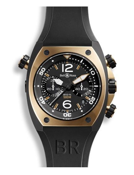 Model: BR02-CHR-BICOLOR - CASE = [Material:Stainless Steel and 18kt Rose Gold], [Case Diameter:44], [Water Resistant:500 Meters - 1640 Feet], [Crystal:Scratch Resistant Sapphire], DIAL = [Color:Black with Luminescent Hands and Numerals and Gold Applique Indices], MOVEMENT = [Type:Automatic], [Crown:Screw Down], BAND = [Clasp:Tang], [Type:Black Rubber], (Usually ships in 2 to 4 weeks.)