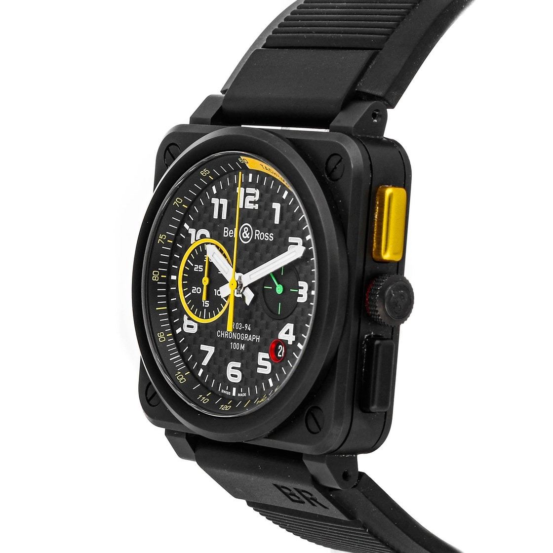 Pre-Owned Bell & Ross BR 03-94 RS17 "Renault Formula 1" (BR0394RS17) self-winding automatic watch, features a 42mm black ceramic case surrounding a black carbon fiber dial on a black rubber strap with a PVD coated stainless steel tang buckle.