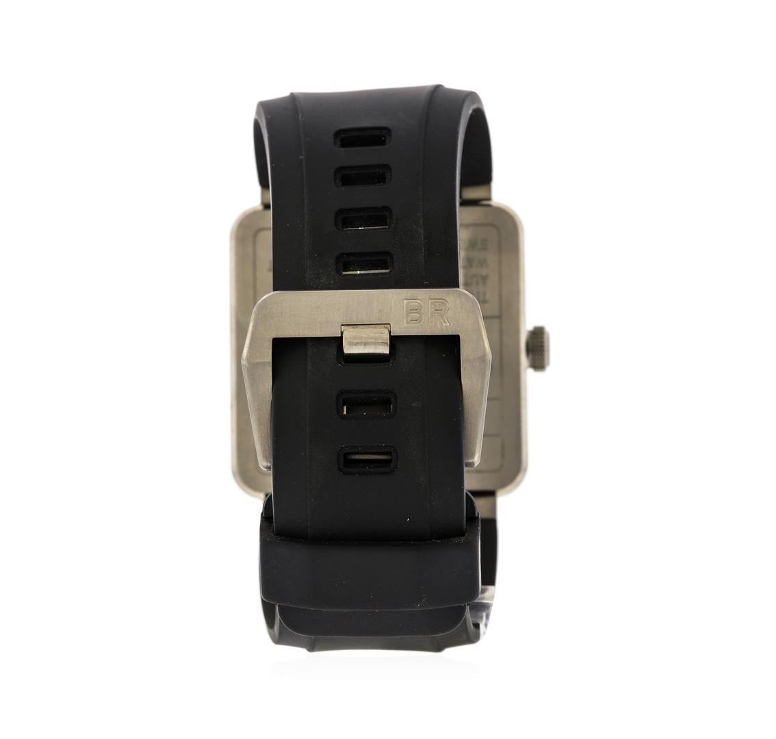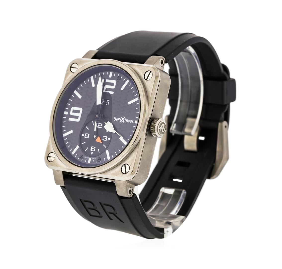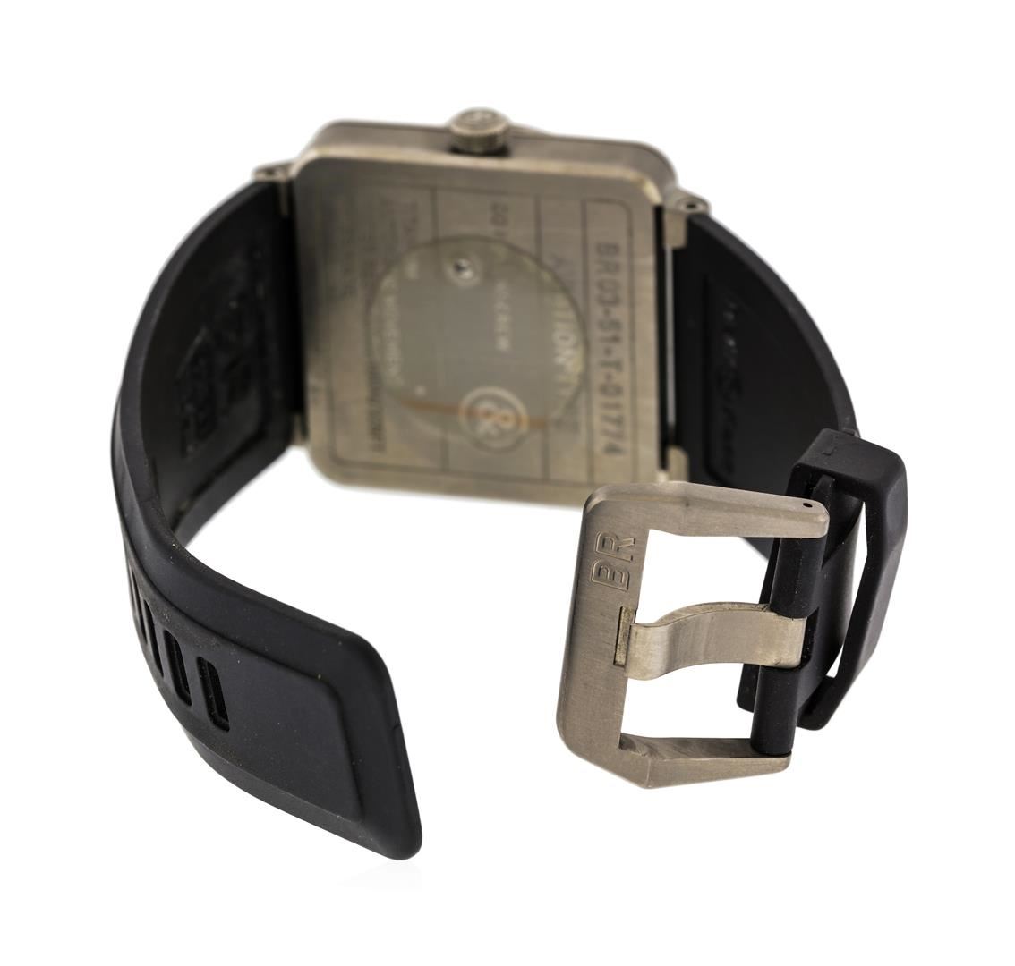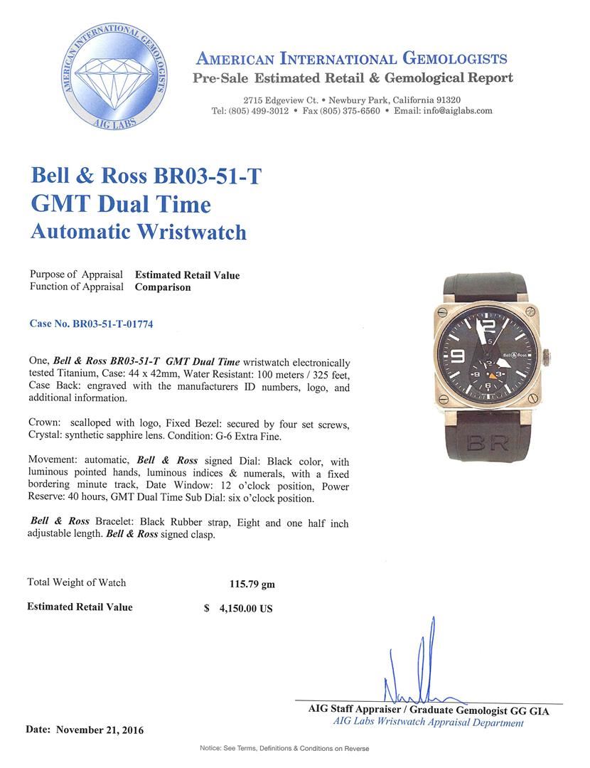 One, Bell & Ross BR03-51-T GMT Dual Time wristwatch electronically tested Titanium, Case: 44 x 42mm, Water Resistant: 100 meters / 325 feet, Case Back: engraved with the manufacturers ID numbers, logo, and additional information. Crown: scalloped with logo, Fixed Bezel: secured by four set screws, Crystal: synthetic sapphire lens. Condition: G-6 Extra Fine. Movement: automatic, Bell & Ross signed Dial: Black color, with luminous pointed hands, luminous indices & numerals, with a fixed bordering minute track, Date Window: 12 o'clock position, Power Reserve: 40 hours, GMT Dual Time Sub Dial: six o'clock position. Bell & Ross Bracelet: Black Rubber strap, Eight and one half inch adjustable length. Bell & Ross signed clasp. Total Weight of Watch 15.79gm. AIG Appraised at $4,150.00.