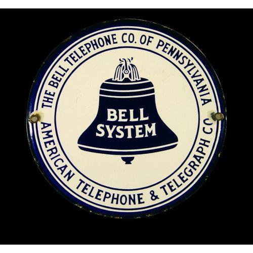 Bell System, one sided convex porcelain sign. American Telephone and Telegraph Co. The Bell Telephone Co. of Pennsylvania. Minor chips at grommets, otherwise excellent condition. 8 inch diameter.