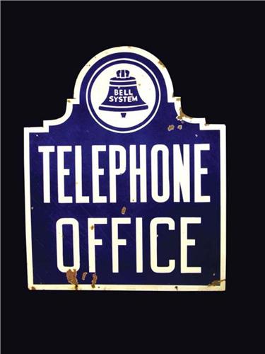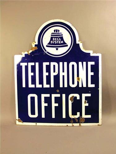 Bell System Telephone Office Die Cut Porcelain Sign. Chips throughout both sides. 25 1/2 X 31 inches.