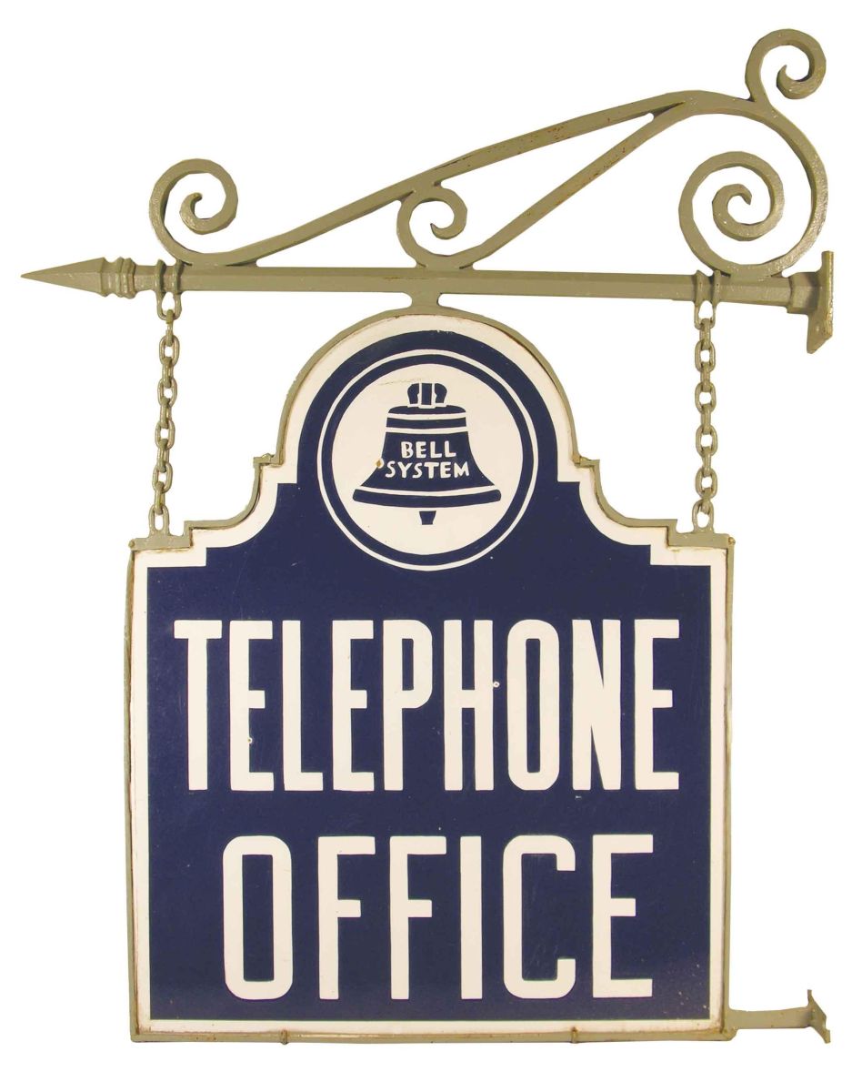 Bell System Telephone Office Porcelain Sign, die cut, two sided in original bracket frame. Three tiny chips on one side otherwise excellent condition. 26 X 31 inches, sign only.
