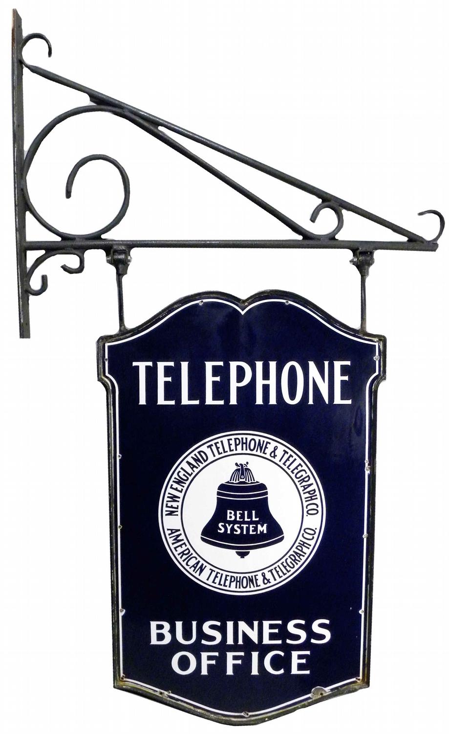 Bell Telephone Porcelain Sign, two sided. This is by far the best condition larger telephone sign we have ever seen. Hard to find anything wrong with it. Comes with original bracket. A few chips around the gromets. 27 1/2 X 43 inches with out the bracket