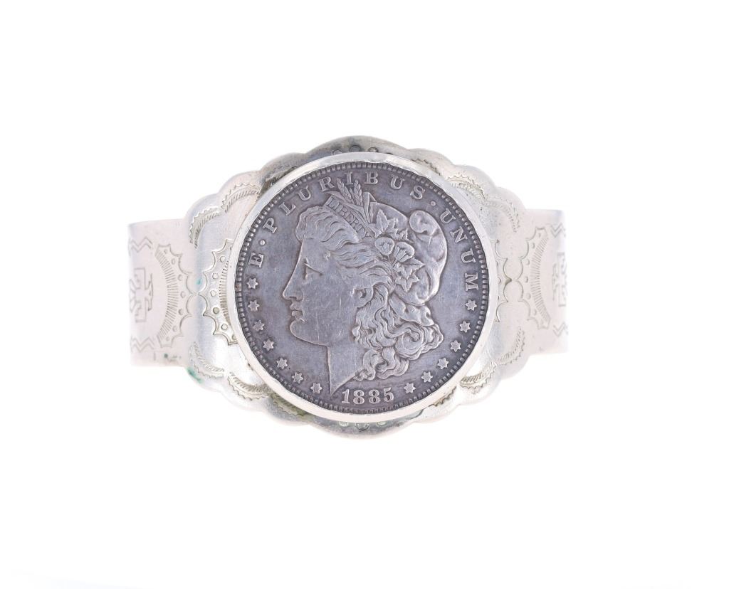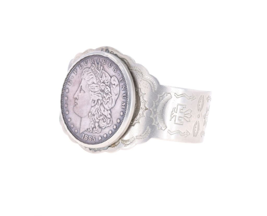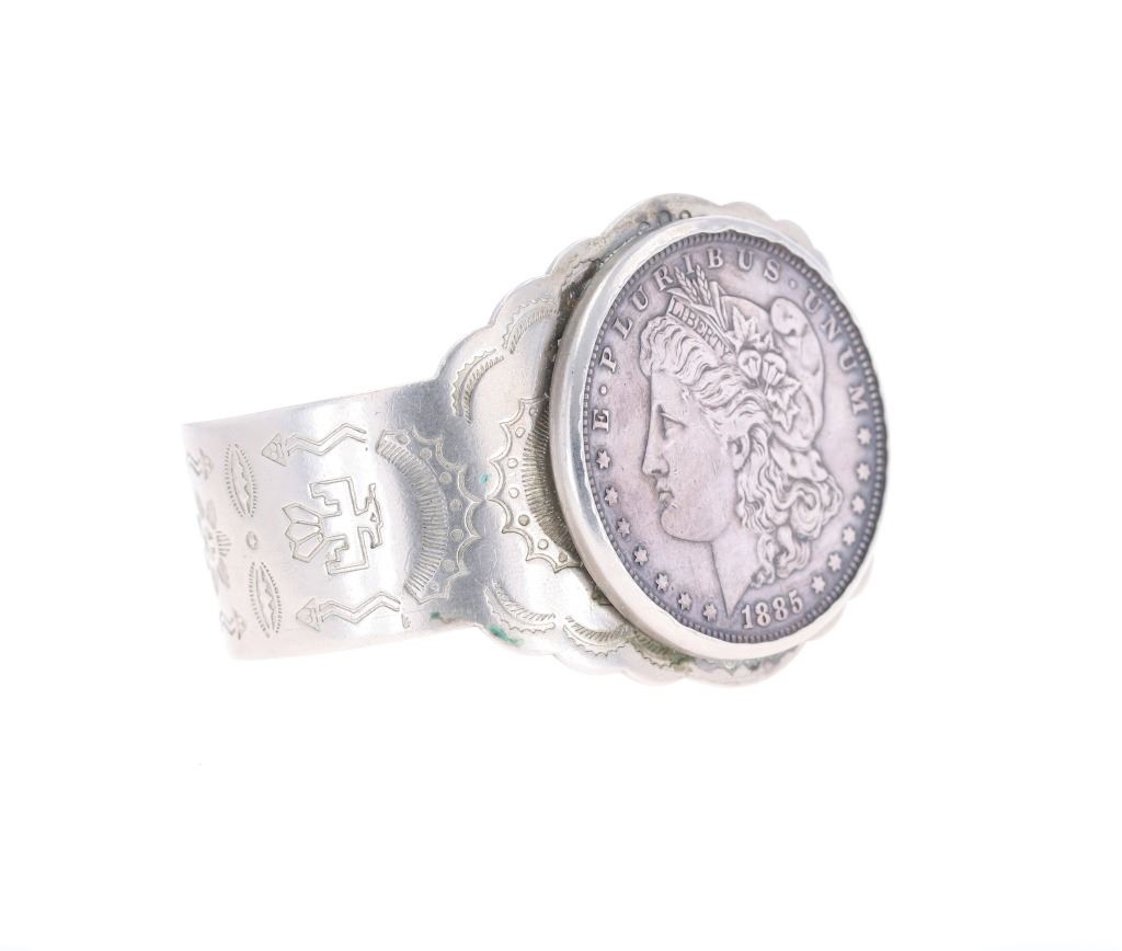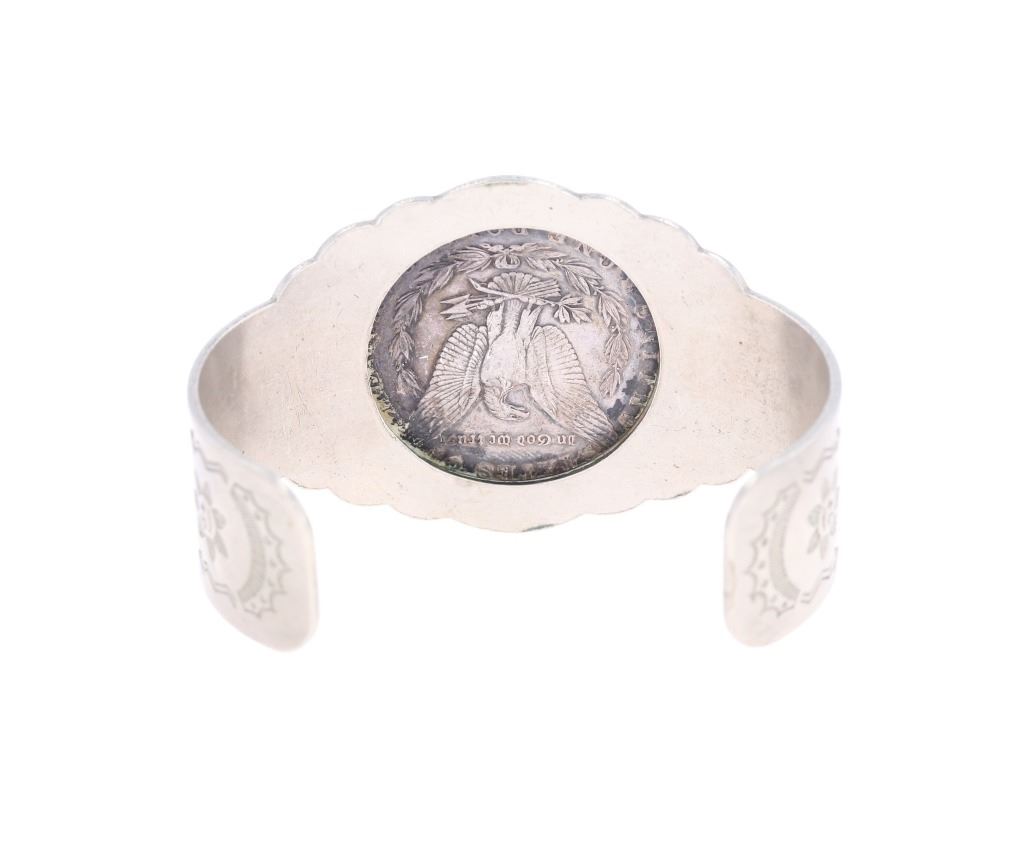Featured in this lot is this Bell Trading Post 1885 Morgan Silver Dollar bracelet. The bracelet features a wonderfully and professionally crafted nickel silver and Morgan Silver dollar construction that shows a traditionally stamped and tooled decoration of Bell Trading Post with a Morgan Silver Dollar in the center mounted to the bracelet frame. Bell Trading Post was a well-known company that operated from 1935 to the 1970s, selling Southwestern and Native American-style jewelry. It was founded by Jack and Mildred Weil in Albuquerque, New Mexico, and became one of the largest producers and distributors of tourist jewelry during its time. The condition of this Bell Trading Post bracelet is well preserved with a slight sunder to the phalange under the coin but otherwise shows a well preserved condition. The overall measurements of this bracelet is 1 7/8" x 2 3/4" x 1 3/4" and the inside length from tip to tip is 5 3/8" and the gap measures 1 5/8". The collective weight of this bracelet is 63.6g.