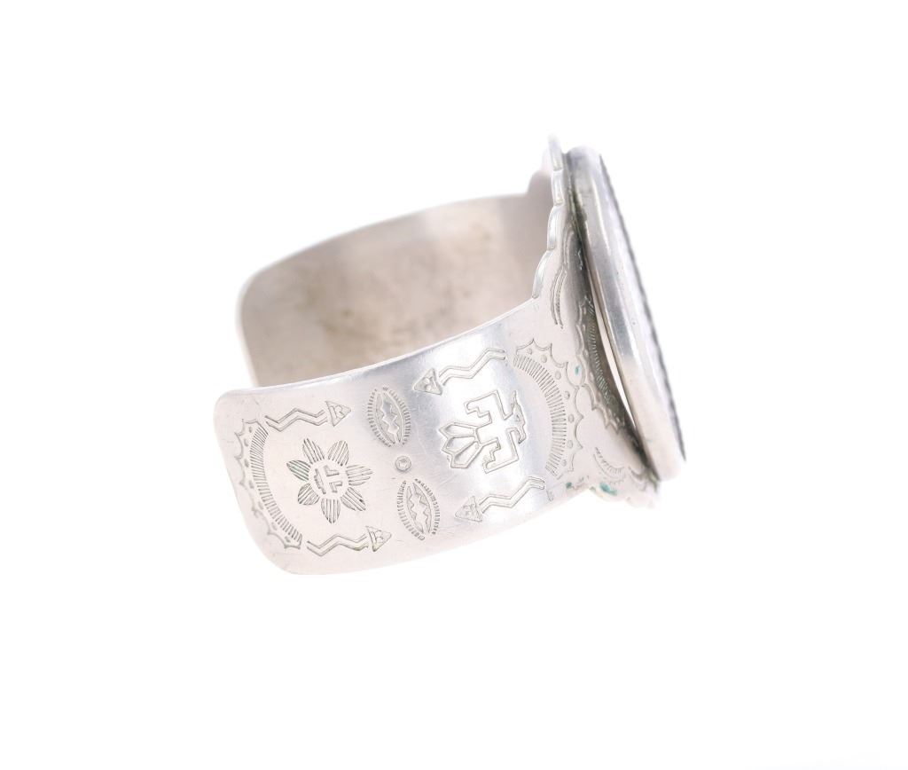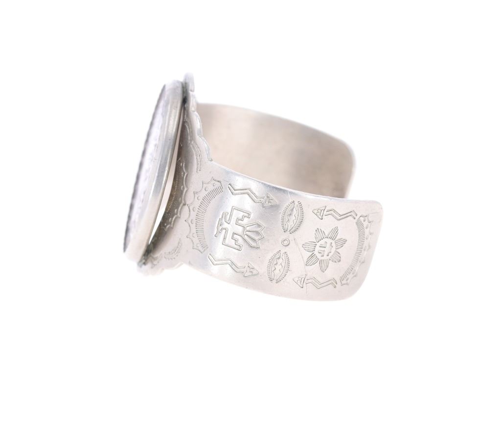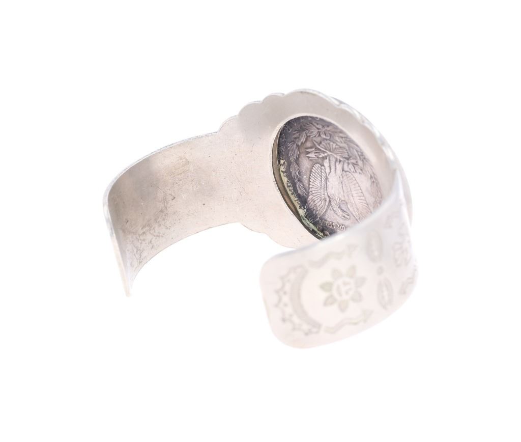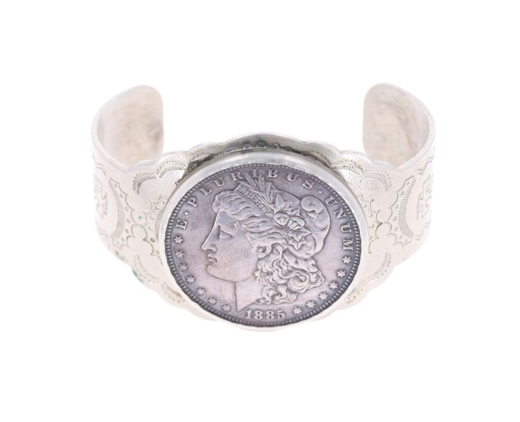 Featured in this lot is this Bell Trading Post 1885 Morgan Silver Dollar bracelet. The bracelet features a wonderfully and professionally crafted nickel silver and Morgan Silver dollar construction that shows a traditionally stamped and tooled decoration of Bell Trading Post with a Morgan Silver Dollar in the center mounted to the bracelet frame. Bell Trading Post was a well-known company that operated from 1935 to the 1970s, selling Southwestern and Native American-style jewelry. It was founded by Jack and Mildred Weil in Albuquerque, New Mexico, and became one of the largest producers and distributors of tourist jewelry during its time. The condition of this Bell Trading Post bracelet is well preserved with a slight sunder to the phalange under the coin but otherwise shows a well preserved condition. The overall measurements of this bracelet is 1 7/8" x 2 3/4" x 1 3/4" and the inside length from tip to tip is 5 3/8" and the gap measures 1 5/8". The collective weight of this bracelet is 63.6g.