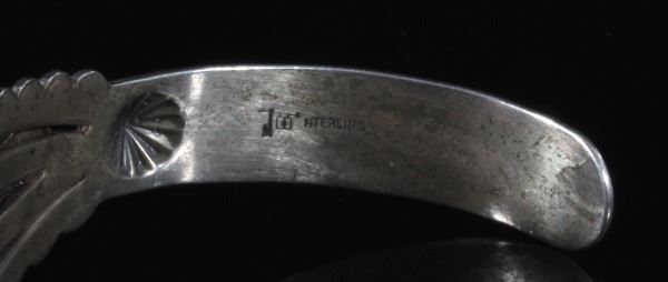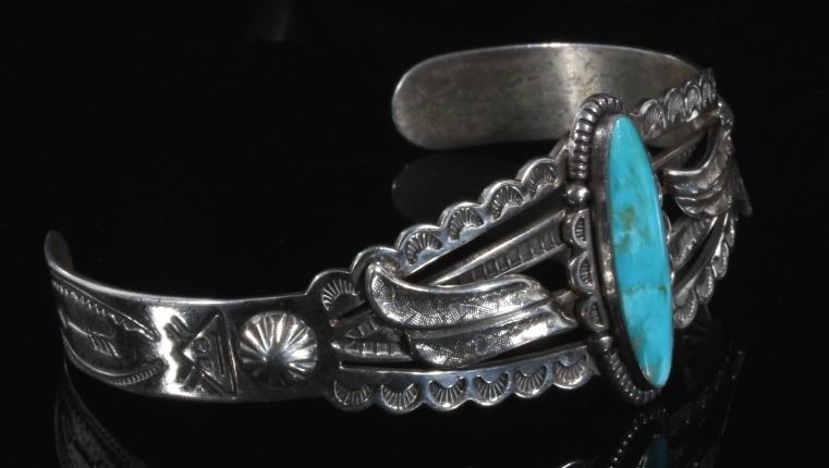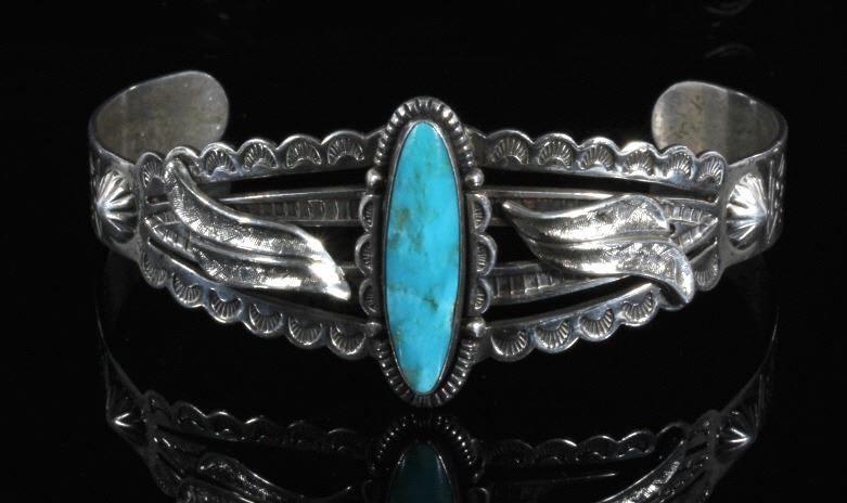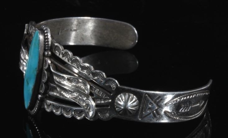 For your consideration is a Bell Trading Post sterling silver and turquoise cuff. The bracelet features a single turquoise stone inset against a elegant Navajo style design. The craftsmanship on the metal work is spectacular. Marked sterling with the Bell Trading Post hallmark on the inside of the cuff.