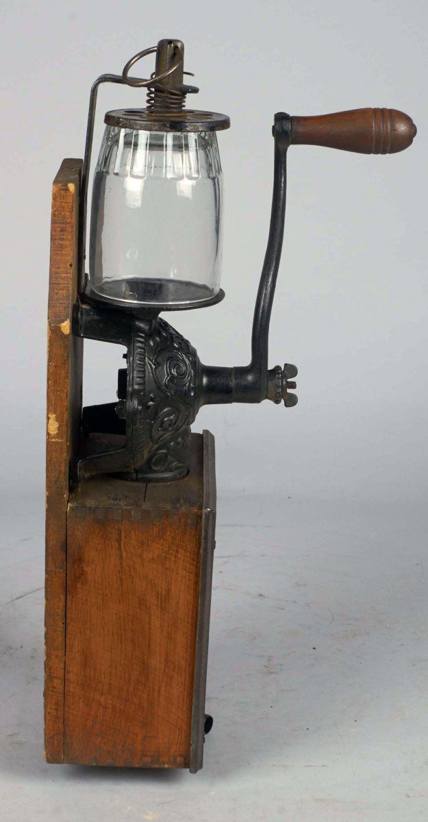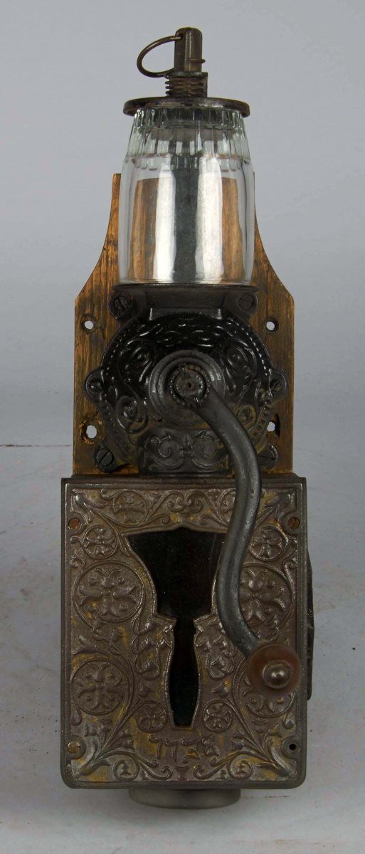 Bell Wall Mount Coffee Grinder with fancy casting, turning crank, and glass cup. Condition (Very Good). Size 17" x 5.5" x 8".