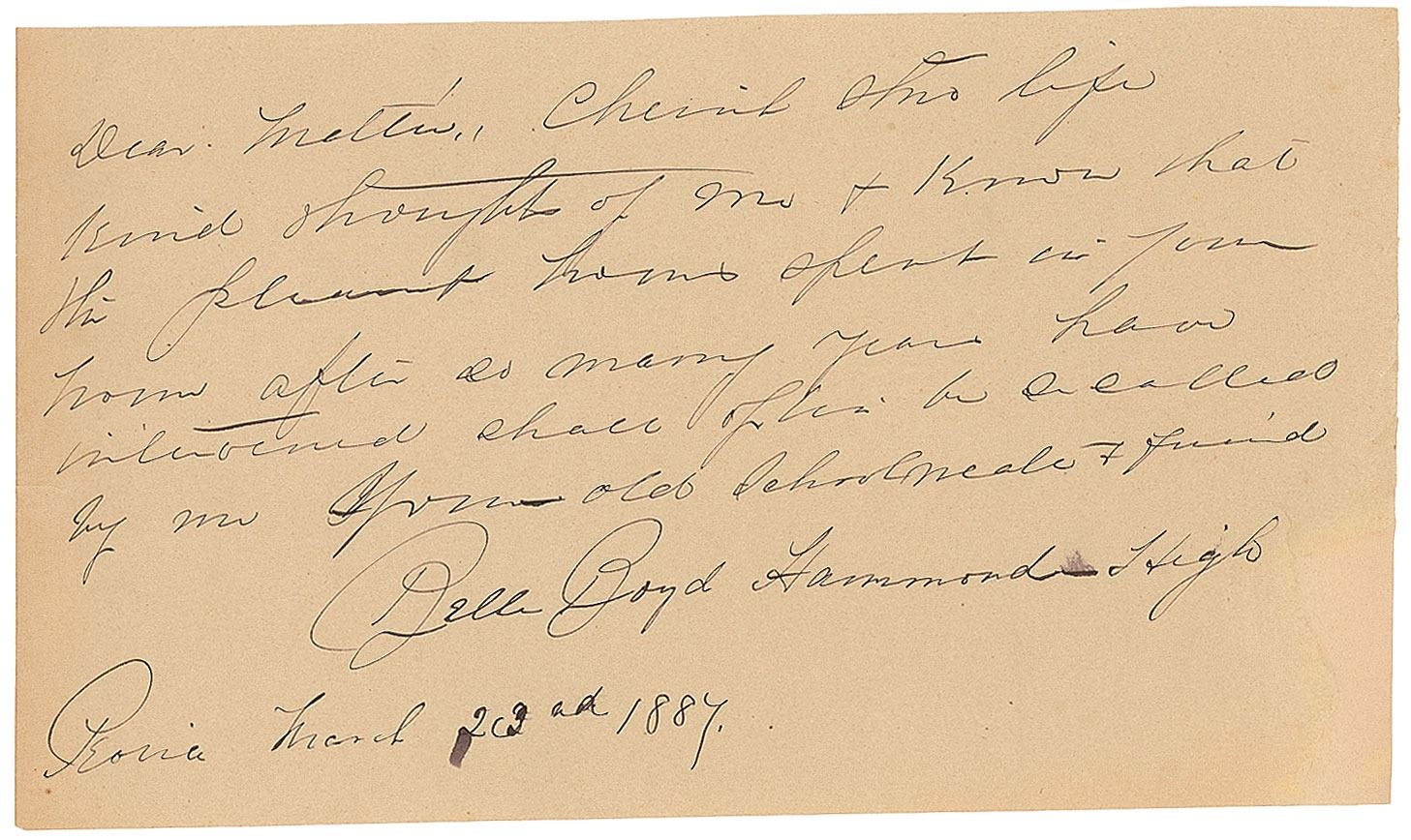 Rare ANS signed “Belle Boyd Hammond-High,” one page, 10.25 x 6, March 23, 1887. A friendly note to “Melton,” in full: “Cherish thru life kind thoughts of me & know that the pleasant hours spent in your home after so many years have intervened shall often be recalled by me. Your old schoolmate and friend.” In fine condition, with repaired paper loss to lower right corner and a few tiny repaired edge tears. Known as the ‘Cleopatra of the Secession,’ Boyd was a Confederate spy in the Civil War who operated from her father's hotel in Virginia and provided valuable information to Confederate General Stonewall Jackson in 1862. After marrying Nathaniel Rue High—her third husband—in the mid-1880s, Boyd toured the United States giving dramatic lectures about her life as a spy. An exceedingly rare Civil War autograph from one of the conflict’s more intriguing figures.