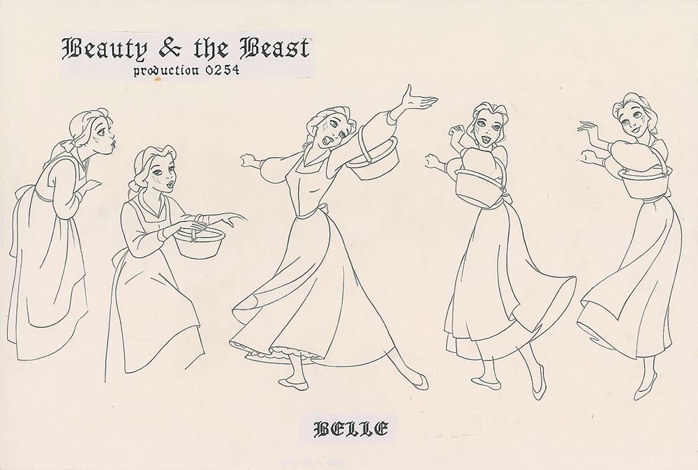 (Walt Disney Studios, 1991) Original character model drawing of Belle in five different poses, accomplished in graphite on untrimmed 17 x 12.5 animation paper. Labels for "Belle" and "Beauty & the Beast, production 0254" are affixed to the sheet. In fine condition.