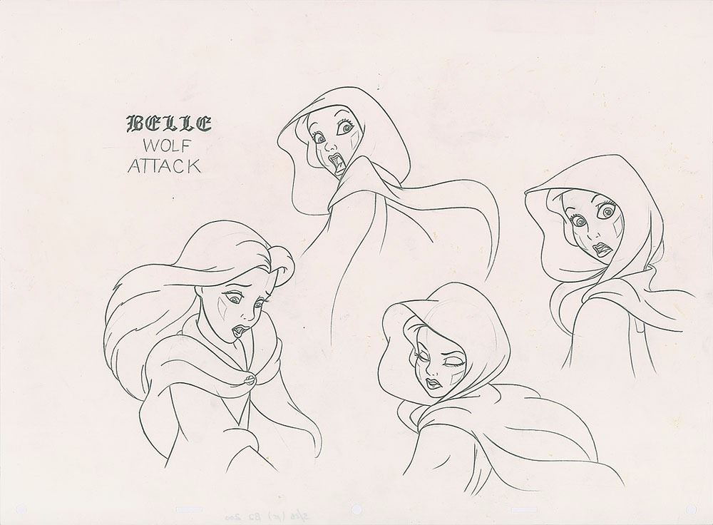(Walt Disney Studios, 1991) Original character model drawing of Belle in four different poses during the wolf attack sequence, accomplished in graphite on untrimmed 17 x 12.5 animation paper. The sheet is labeled, "Belle, Wolf Attack," in pencil. In fine condition.