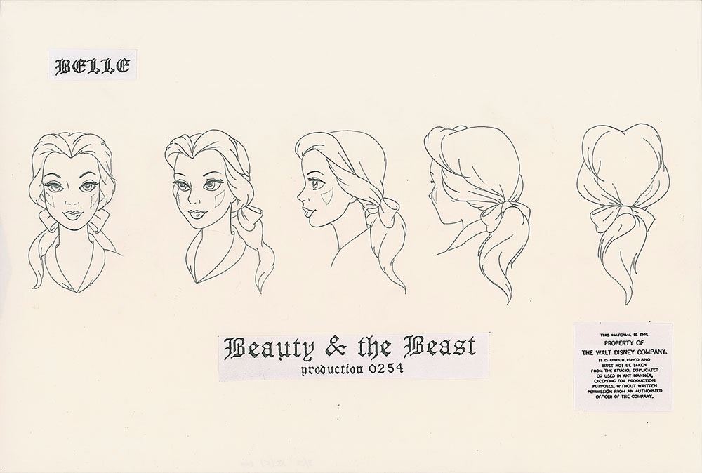 (Walt Disney Studios, 1991) Original character model drawing of Belle's face from five angles, accomplished in graphite on untrimmed 17 x 12.5 animation paper. Three identification labels are affixed to the sheet. In fine condition.