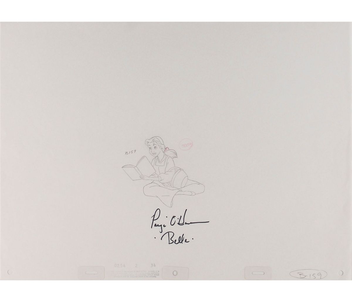 (Walt Disney Studios, 1991) Original production drawing featuring Belle from Beauty and the Beast. Accomplished in graphite on untrimmed 17 x 12.5 animation paper. Image of Belle reading a book measures 4.25 x 3.75. Signed in black felt tip by the voice of Belle, Paige O’Hara. In fine condition.