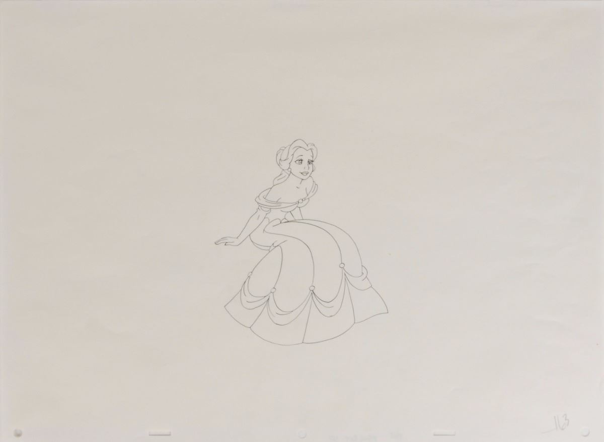 (Walt Disney Studios, 1991) Original production drawing featuring Belle from Beauty and the Beast, showing her seated in her ball gown. Accomplished in graphite on untrimmed 17 x 12.5 animation paper. Image measures 4.5 x 5.75. In fine condition.
