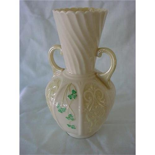 8 inches Tall on a 2 1/4 inch Flat Foot ** Panel Vase in Shamrock Pattern ** 8 Panels ** 2 Shamrock, 2 Plain and 4 Shiney Gold Luster ** Ovoid Body with 2 Handled Cone Neck ** Circa 1956 - 1965 ** Excellent Condition