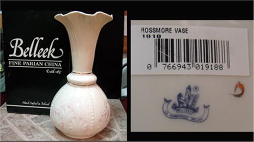 Belleek B1918 "Rossmore" vase standing 9" tall. No chips or cracks with its original green box.