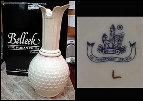 Belleek B1946 "Paros" vase standing 11" tall. No chips or cracks with its original green box