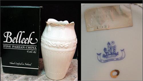 Belleek B1998 "Bacchus" vase standing 6 3/4" tall. No chips or cracks with its original green box