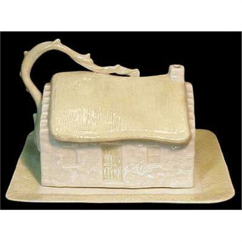 This is a quaint Irish Belleek fine porcelain butter or cheese dish in the shape of a cottage. The cover measures 5 x 3 3/4 inches, while the tray measures 6 1/2 x 5 1/4 inches The combined height is almost 5 inches It bears the yellow (7th) mark, and is in perfect condition. A superb example of the exquisite craftsmanship found in Irish Belleek parian china.
