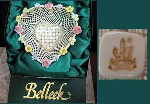 Belleek Heart Basket First Gold or Seventh Mark - c1981-1992 no chips or cracks, flowers intact. In original lined presentation box. Measures 6" across