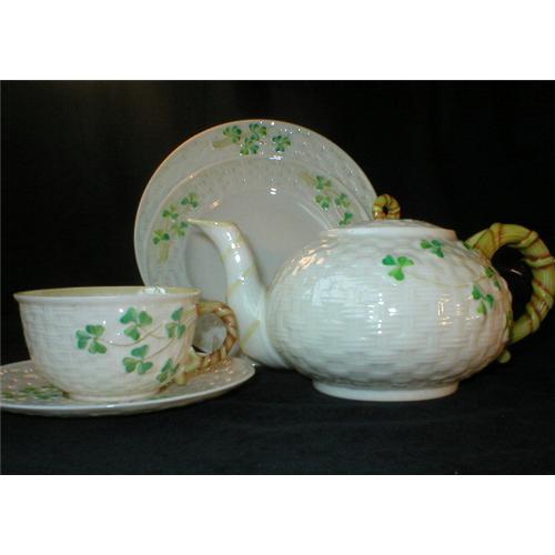 <table width="100%" border="0" cellspacing="0" cellpadding="4"><tr><td><em> Complete Set of Beleek</em></td></tr><tr> <td width="100%"> A complete Shamrock Tea set that includes 4 cups and saucers, four dessert plates, 6.25"; four luncheon plates, 7"; a cream and sugar set; and a 4 cup teapot. These all have the same First Green Mark or Fourth Mark and are not an assembled set. These were produced from 1946-1955. All have been well cared for and are in excellent condition.