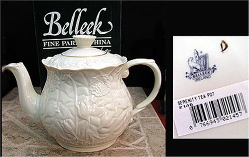 Belleek Serenity Tea Pot Ninth Mark - c1997 - 1999 has a small chip to inside rim. Stands 6" tall to finial. With original box