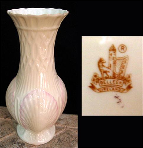 Belleek Shell Vase First Gold or Seventh Mark - c1981-1992 (gold was replaced with Tan), no chips or cracks stands 7 1/2" tall with original box