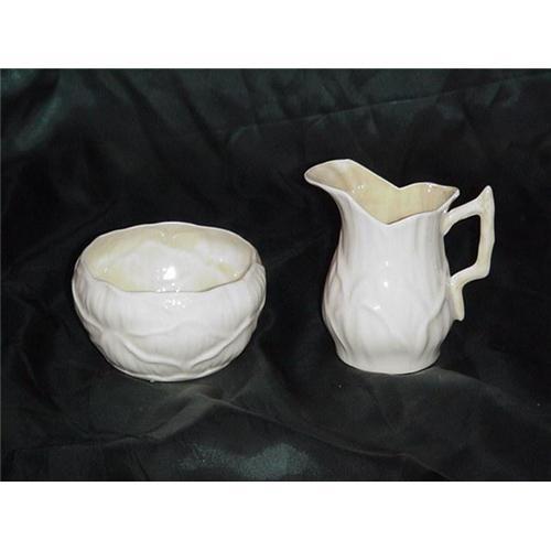 Belleek sugar and creamer, bowl 3 1/2" dia x 2" tall, creamer 3 1/2" tall. Green mark, shown.