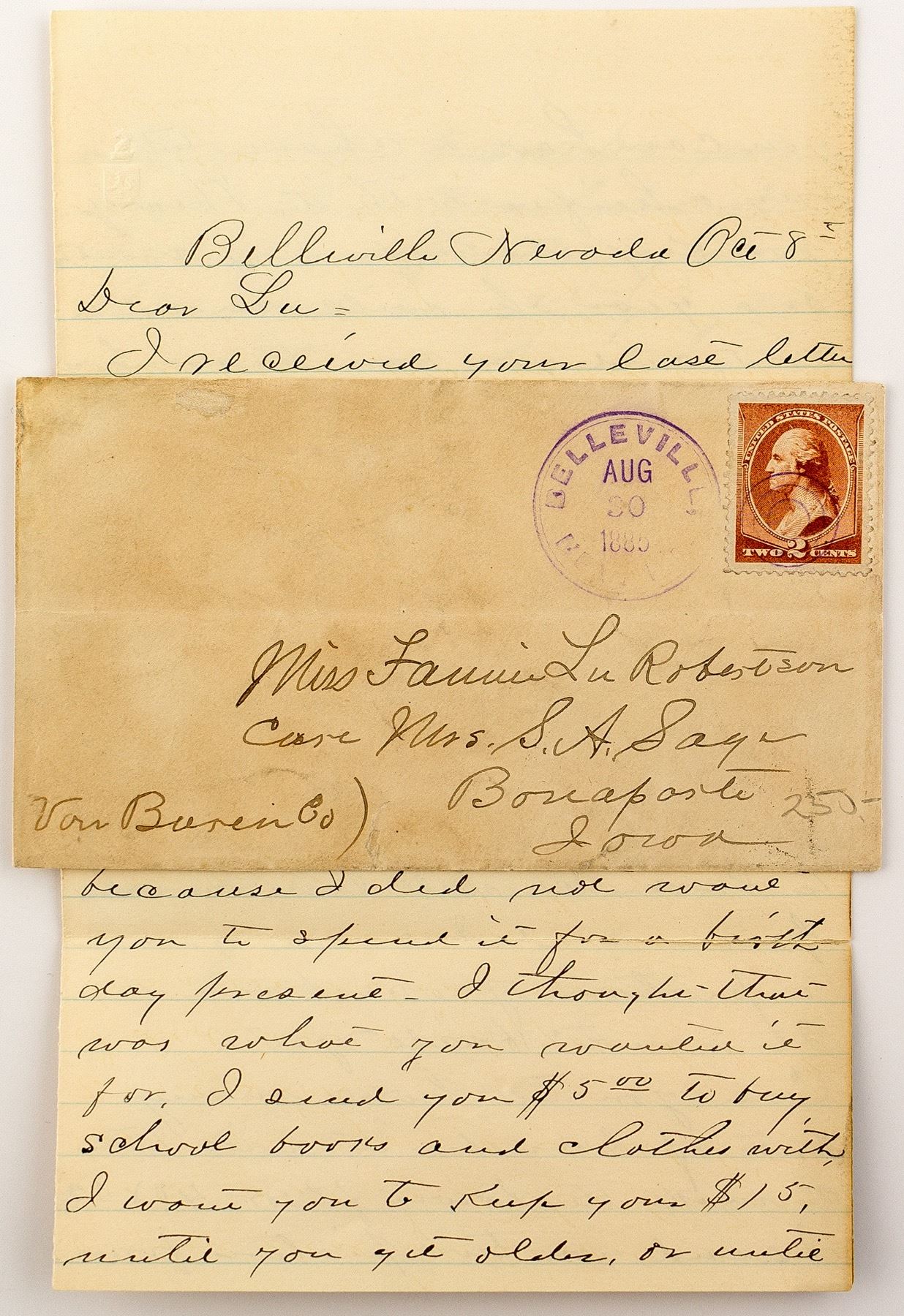 R-6. Magenta double ring cancel with target killer. Cancel is good, strong and easily read - although bottom half is faint. Belleville post office was open from 1874 to 1894. Letter is very fragile with long rips at folds. Letter signed as 'Doc." He owns a drug store in Belleville and as soon as he gets someone to buy it, he is heading back to Iowa! State: Nevada City: Belleville HWAC#: 46590 Date: 1885