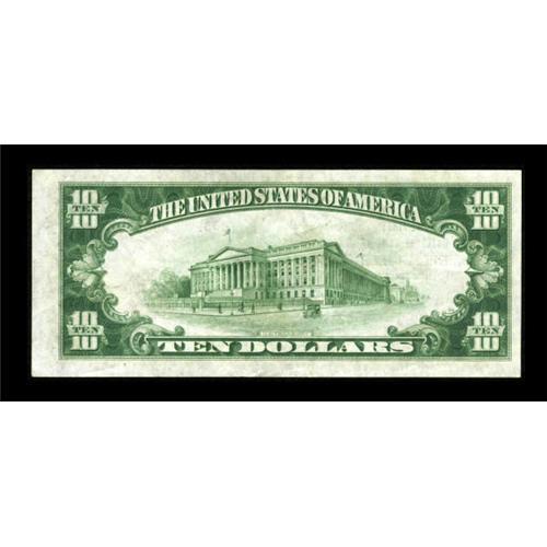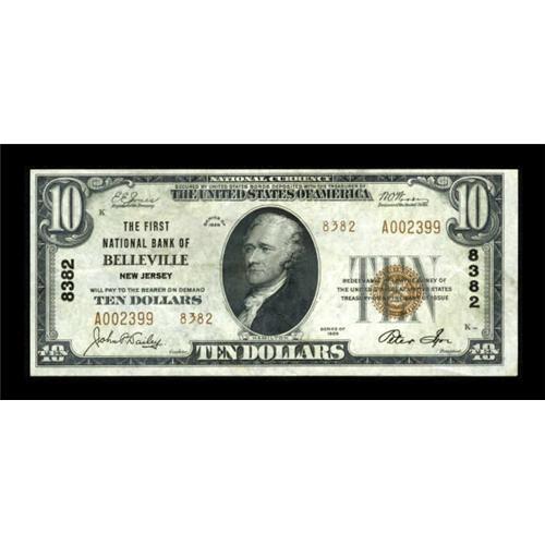 <B>Belleville, NJ </B></I>- $10 1929 Ty. 2 <B>The First NB</B></I> Ch. # 8382<B></B></I><BR> There is a bit of handling present and the centering is less than perfect, but this piece is, with the sole exception of the one known serial number 1 from here, the only uncirculated example known from this bank. <B>Crisp Uncirculated.<BR></B></I><I>From The John Ameen Collection</B></I><BR><BR><b>Shipping:</b> Coins & Currency (<a target="_blank" href="http://www.heritageauctions.com/common/shipping.php">view shipping information</a>)