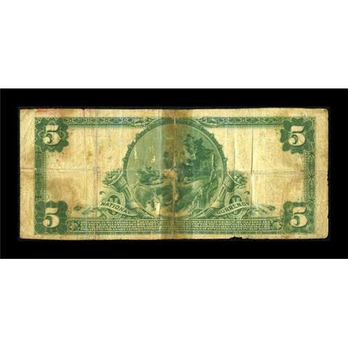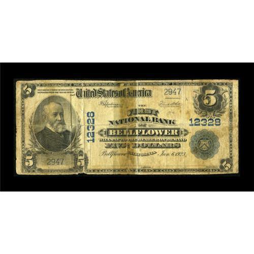 <B>Bellflower, CA</B></I> - $5 1902 Plain Back Fr. 609 <B>The First NB</B></I> Ch. # 12328<BR> The census list this note and just five others for this rare Los Angeles County bank. This <B>Very Good</B></I> $5 has a large repair and the signatures have faded. This bank only had a paltry $635 large size outstanding as of 1935. <BR><I>From The Kansas City Collection.</B></I><BR><BR><b>Shipping:</b> Coins & Currency (<a target="_blank" href="http://www.heritageauctions.com/common/shipping.php">view shipping information</a>)