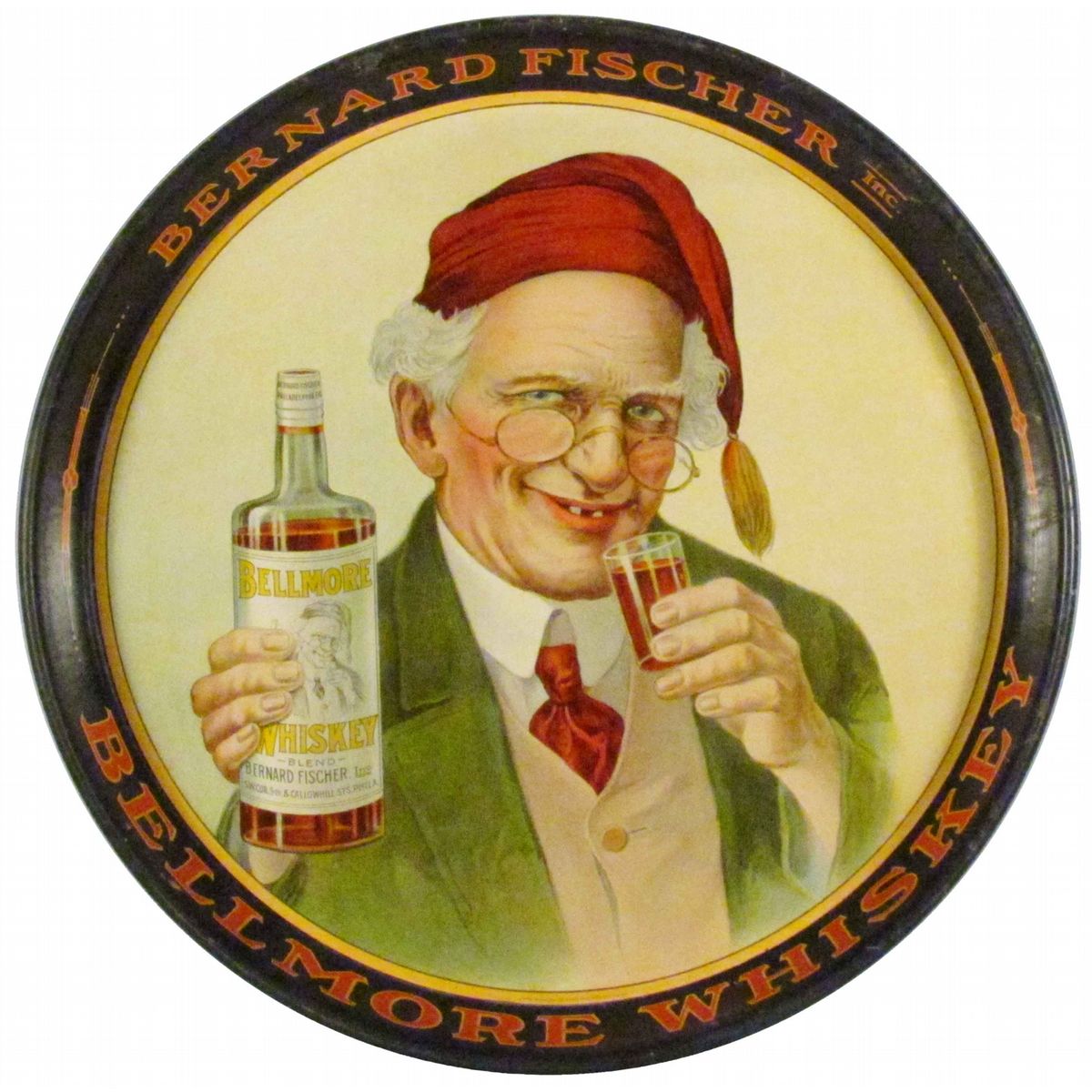 Bellmore Whiskey Tin Serving Tray. Bernard Fischer Inc. Phila. Man in stocking cap having a nip. Some edge ware otherwise very good condition. 12 inch diameter.