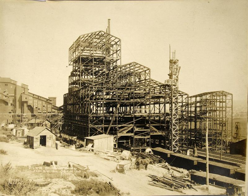 Bellevue Gully construction project. Photograph measures 10”x8”, no matte, high to medium contrast—minor yellowing, and the focus is sharp. Photographer identified as Horgan. Horse and wagon sit amidst building materials and a steel frame construction project towers in the background. Location may be Bellvue, Colorado. Not verified. The Photo reads, “D.L. + W. BELLVUE GULLY, FROM N.W. Cor.”