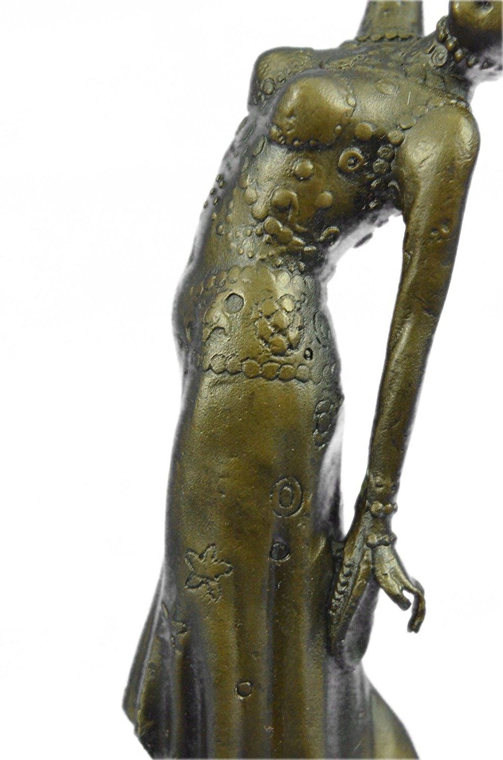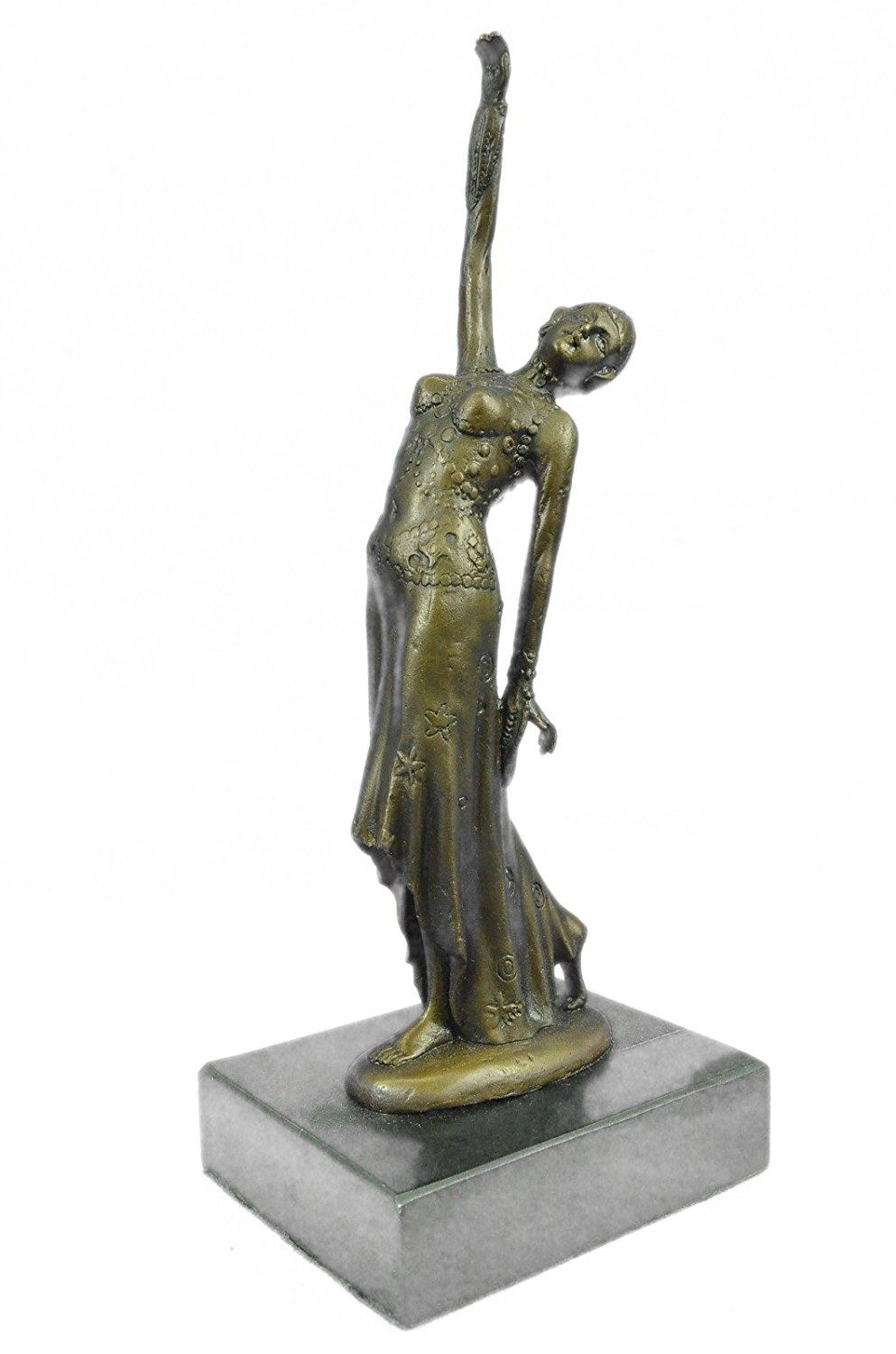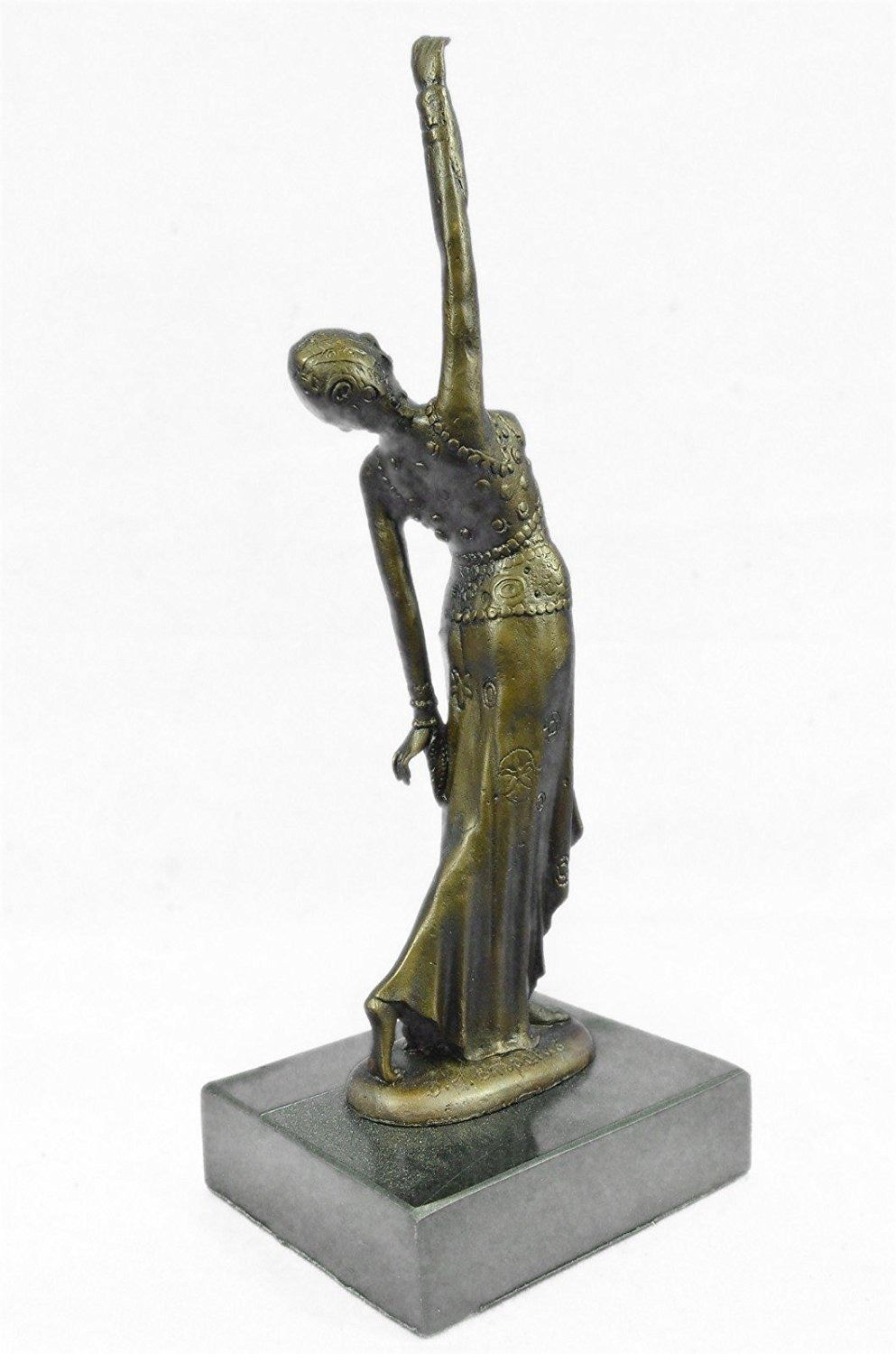 The belly dancer presents herself with both crossed arms above her head. She tiptoes forward seductively, as the beads of her costume jangle with her movement, enticing her audience. She was captured using the ageold method of lostwax casting and stained with a brown patina for preservation. The bronze sculpture is mounted upon a black marble base. Bronze Dimensions with Marble Base: Height 12 X Width 5 inches. Weight: 5 LBS. Inventory: 95Y3962259