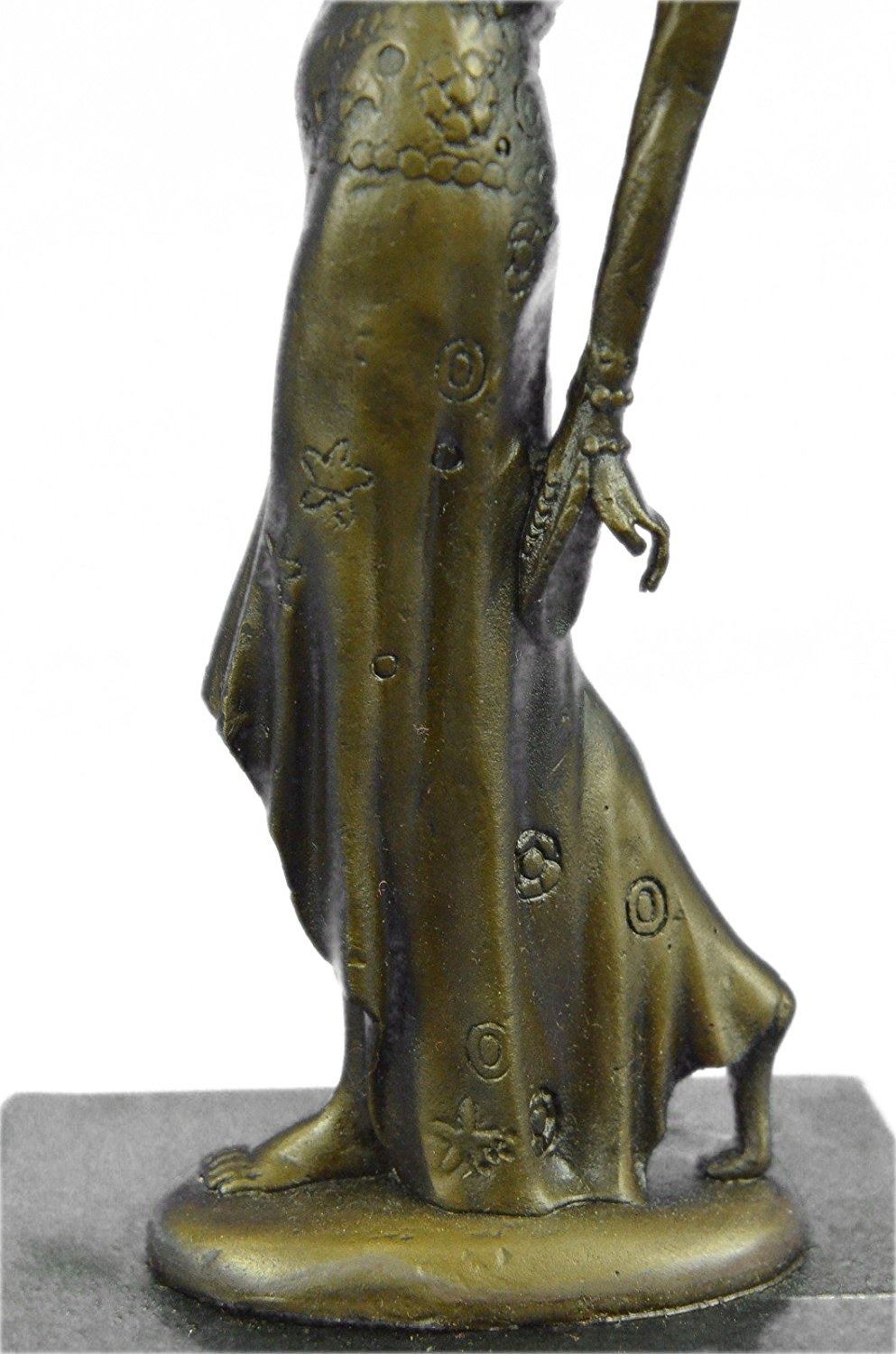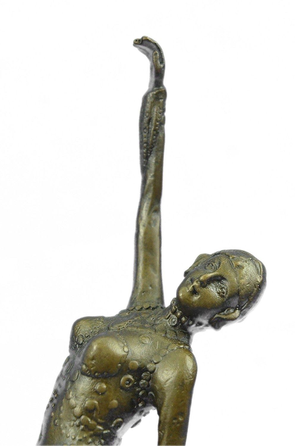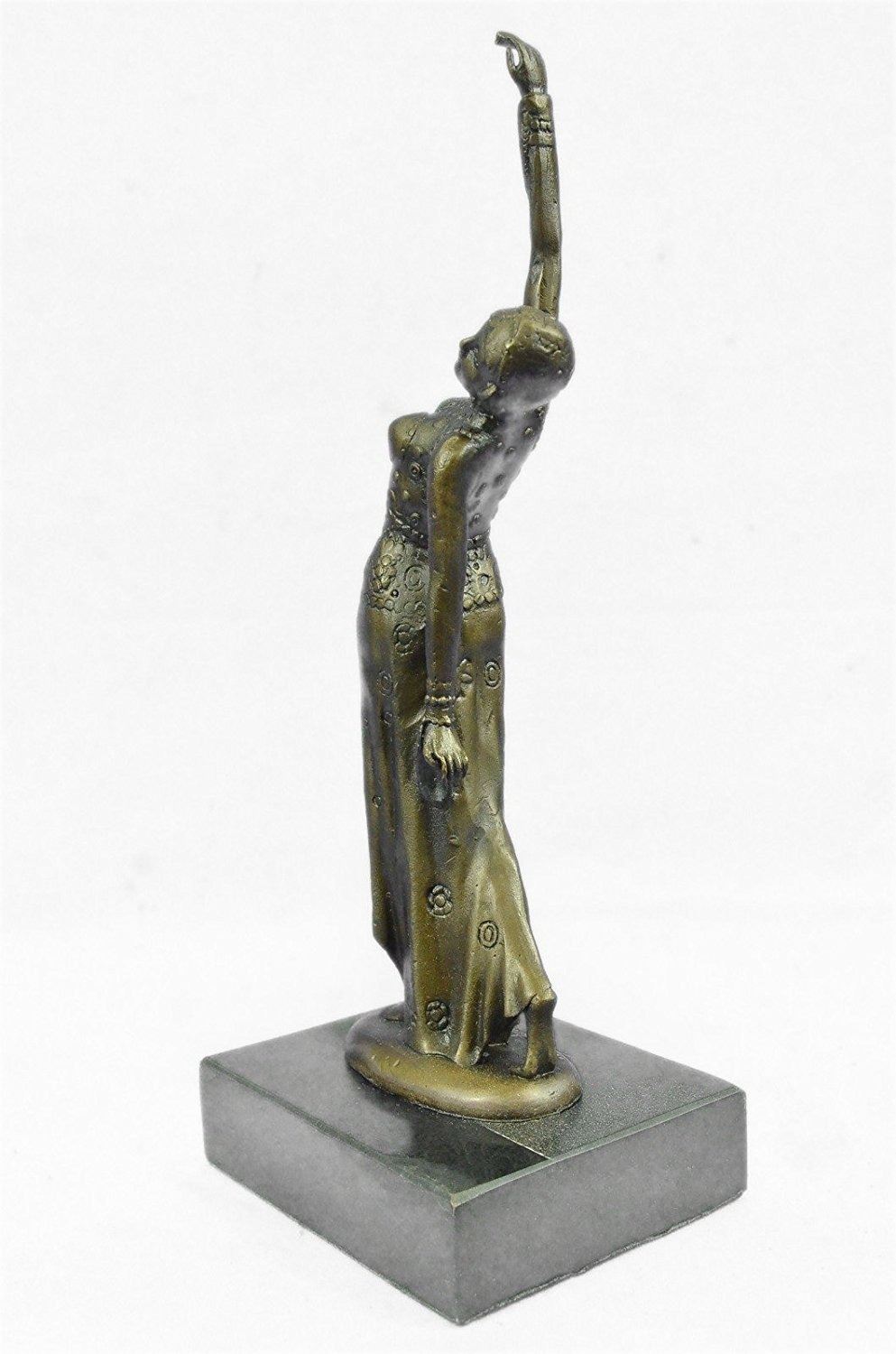 The belly dancer presents herself with both crossed arms above her head. She tiptoes forward seductively, as the beads of her costume jangle with her movement, enticing her audience. She was captured using the ageold method of lostwax casting and stained with a brown patina for preservation. The bronze sculpture is mounted upon a black marble base. Bronze Dimensions with Marble Base: Height 12 X Width 5 inches. Weight: 5 LBS. Inventory: 95Y3962259