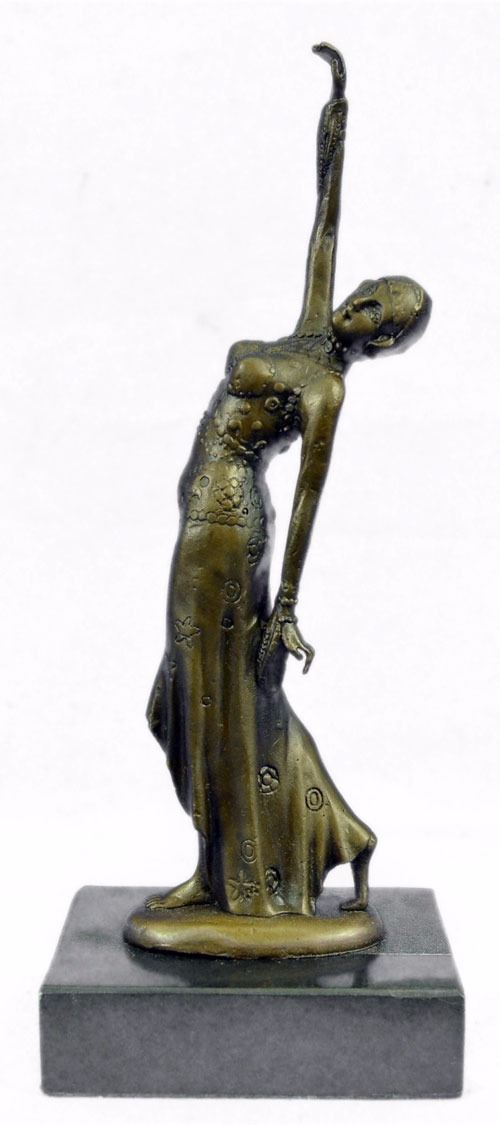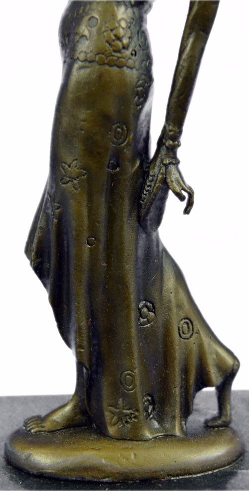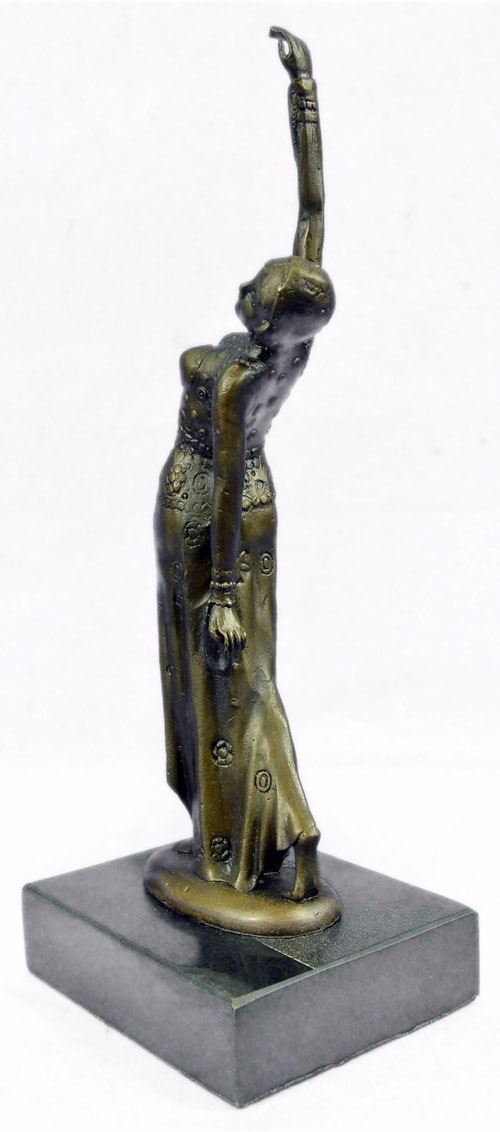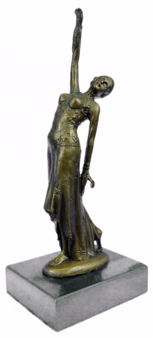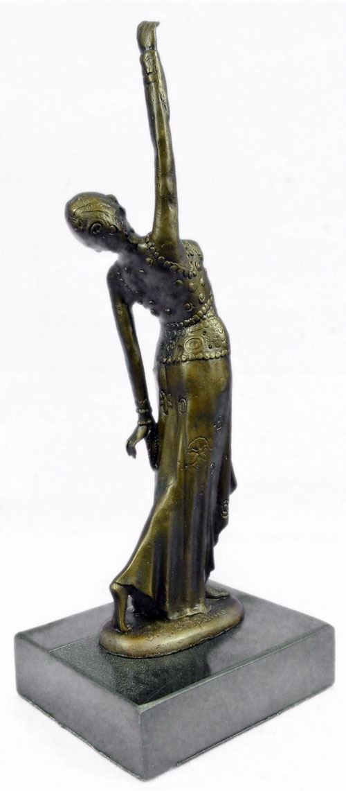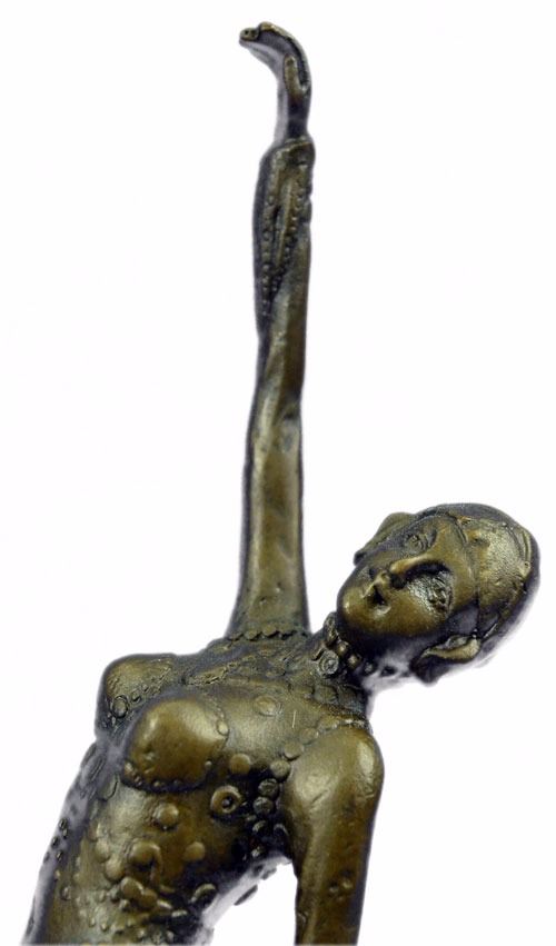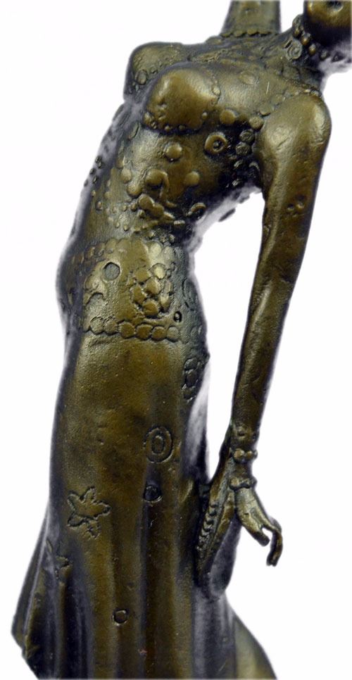 The Belly Dancer Presents Herself With Both Crossed Arms Above Her Head. She Tiptoes Forward Seductively, As The Beads Of Her Costume Jangle With Her Movement, Enticing Her Audience. She Was Captured Using The Age-Old Method Of Lost-Wax Casting And Stained With A Brown Patina For Preservation. The Bronze Sculpture Is Mounted Upon A Black Marble Base. Bronze Dimensions With Marble Base: Height 12" X Width 5". This is very interesting bronze sculpture based on the original piece.