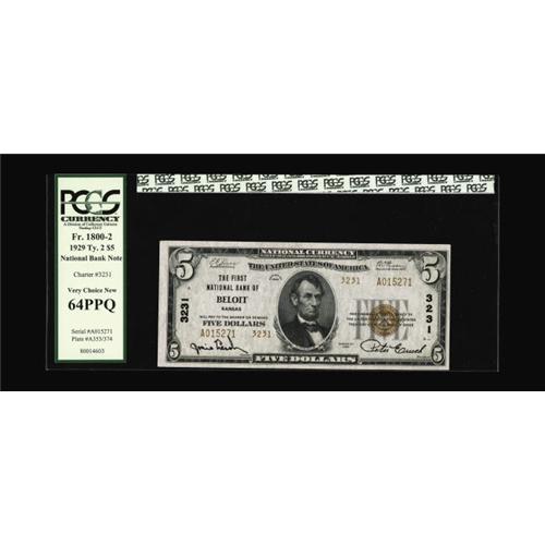 <B>Beloit, KS</B></I> - $5 1929 Ty. 2 <B>The First NB</B></I> Ch. # 3231<BR>A <B>PCGS Very Choice New 64PPQ</B></I> from a run of roughly 30 or so of this type and denomination from here that were fortuitously set aside years ago by a foresighted bank officer and can now be enjoyed and savored by the collecting fraternity.