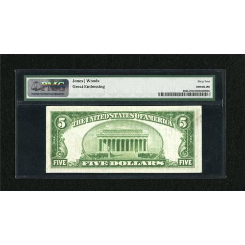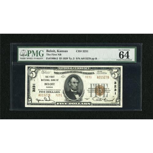 <B>Beloit, KS</B></I> - $5 1929 Ty. 2 <B>The First NB</B></I> Ch. # 3231<BR> This bright and original note is well margined and does exhibit "Great Embossing." <B>PMG Choice Uncirculated 64 EPQ</B></I>.<BR><I>From The J.S. Weber Collection.</B></I><BR><BR><b>Shipping:</b> Coins & Currency (<a target="_blank" href="http://www.heritageauctions.com/common/shipping.php">view shipping information</a>)