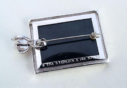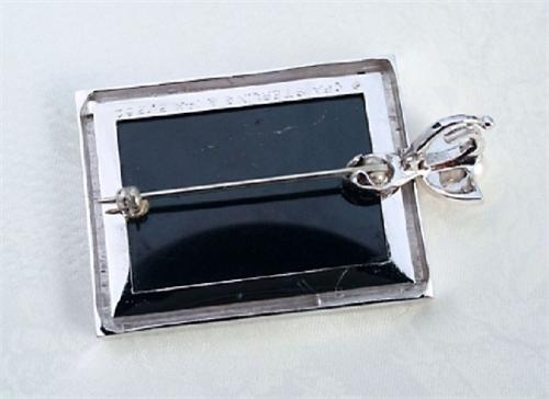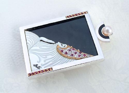 Erte, Romain de Tirtoff Conte (Russian/French 1892-1990) signed and editioned 248 of 250, Sterling silver with 25 rubies and diamond chips, mother of pearl face and black jade backing, 1 1/2" by 1". Sterling fixture for chain to be attached with mother of