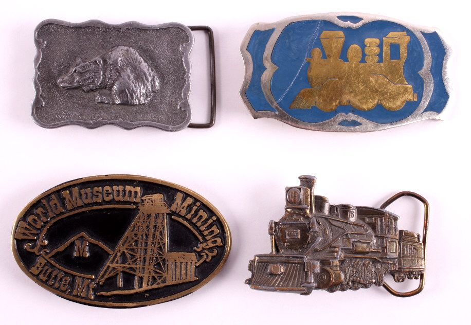This is a collection of four belt buckles. Two buckles feature a train locomotive, one has a grizzly bear, and the last one is from the World Museum of Mining in Butte Montana. Each of the buckles is in very good condition and would be a great addition to any collection.