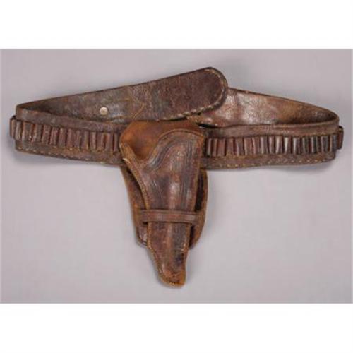 <B>BELT AND HIOLSTER RIG</B></I> - Well-used, but soft and supple cartridge belt with holster. Holster is a tooled, form-contoured, single-loop half-backed variant that originally housed a short-barrel Col single-action revolver. Holster is untrimmed. Belt has a large clipped, nickel-plated buckle, and is stamped “32” on the billit.<BR><BR><b>Shipping:</b> Miscellaneous Collectibles, Larg (<a target="_blank" href="http://www.heritageauctions.com/common/shipping.php">view shipping information</a>)